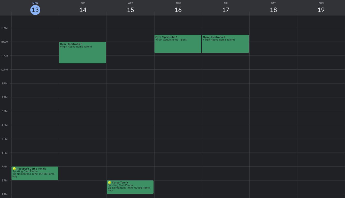 I go to the gym to lift weights and I play tennis. I now accept the fact that I can’t do every thing I want, I need to choose. So I’m just going to lift weights and play tennis, for a total of 5 days a week: tennis on Monday and Wednesday, and weights on Tuesday, Friday and Thursday or Saturday, depending on my perceived and recorded effort during the Wednesday tennis training. I’ll also use the Saturday workout, when I do it, and extend the stay at the gym to relax a bit and maybe take a swim after the workout, or get in the sauna for 10-15 minutes.